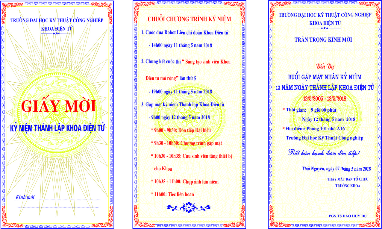 Trân trọng kính mời Quý vị đại biểu, Quý Thầy và Cô, các thế hệ Sinh viên, Học viên cao học về dự buổi gặp mặt và tham gia chuỗi chương trình kỷ niệm ngày thành lập Khoa Điện Tử (12/5/2005-12/5/2018)